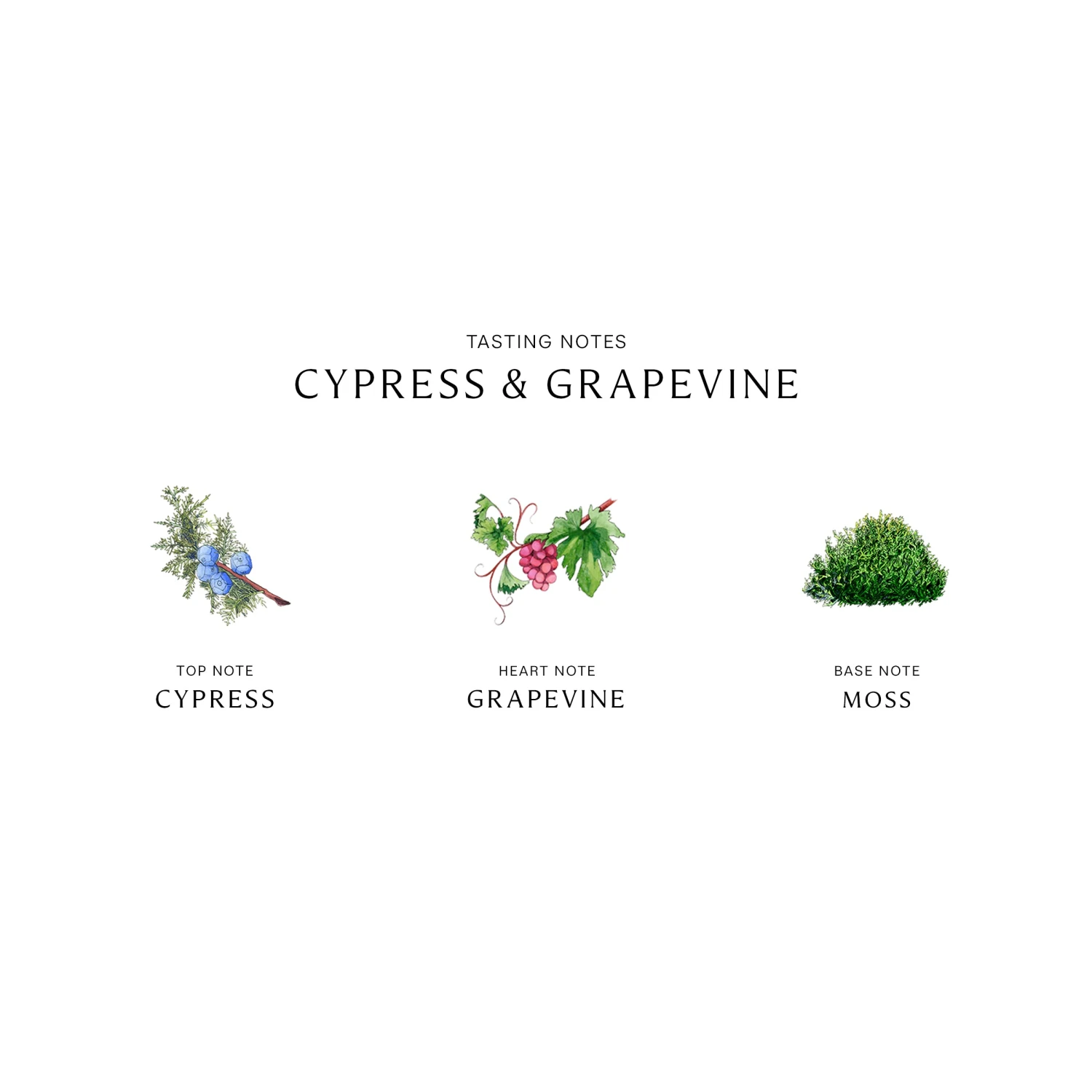 Mid – Grapevine A sensual woody accord. An unexpected blend of natural cedarwood and vetiver, complemented with warm amber and juicy grape notes.